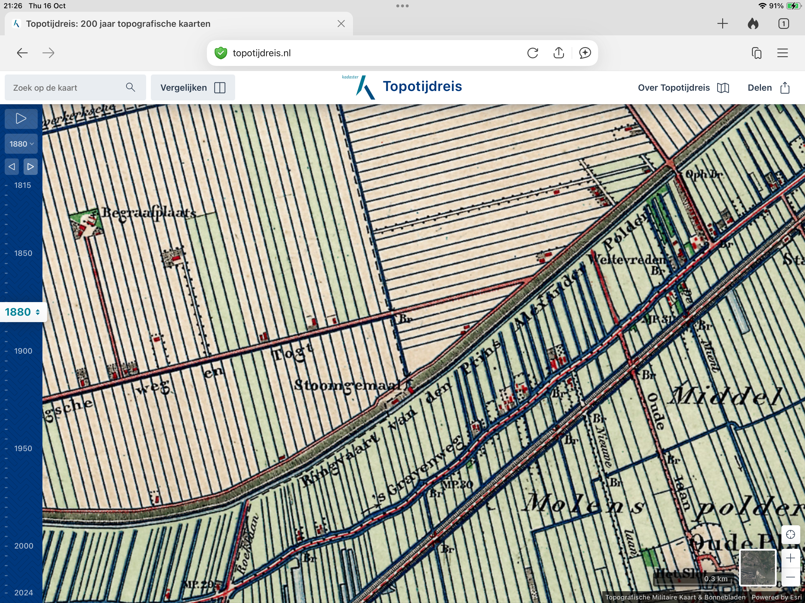 Op de kaart van 1880 is de Prins Alexanderploder ingepolderd. Ten noorden van de Hollandse IJssel zijn de spoorlijn Rotterdam - Gouda, de 's-Gravenweg, de Ringvaart en de Bermweg te zien.